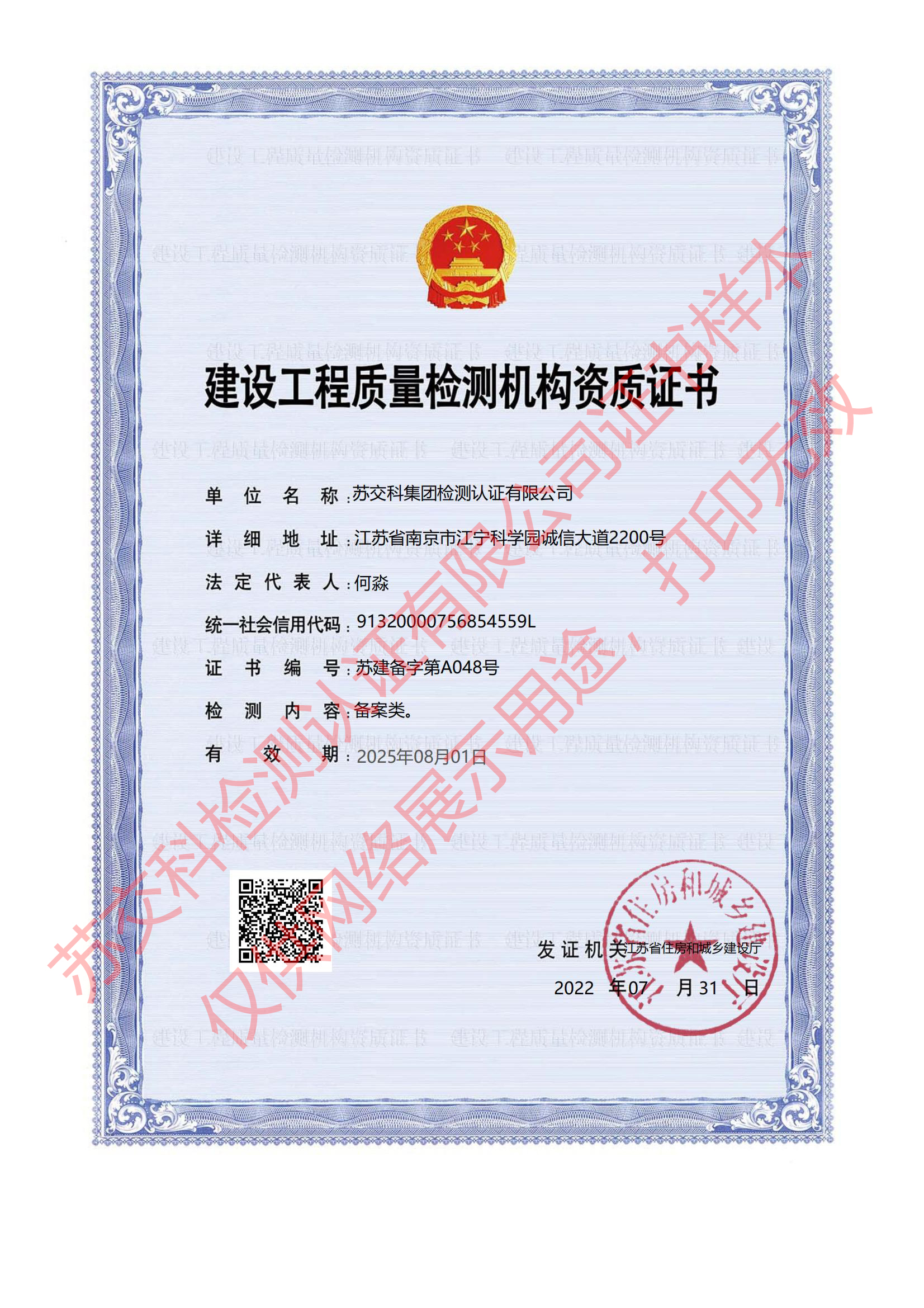 蘇交科檢測認(rèn)證建設(shè)工程質(zhì)量檢測機(jī)構(gòu)資質(zhì)證書(備案類)
