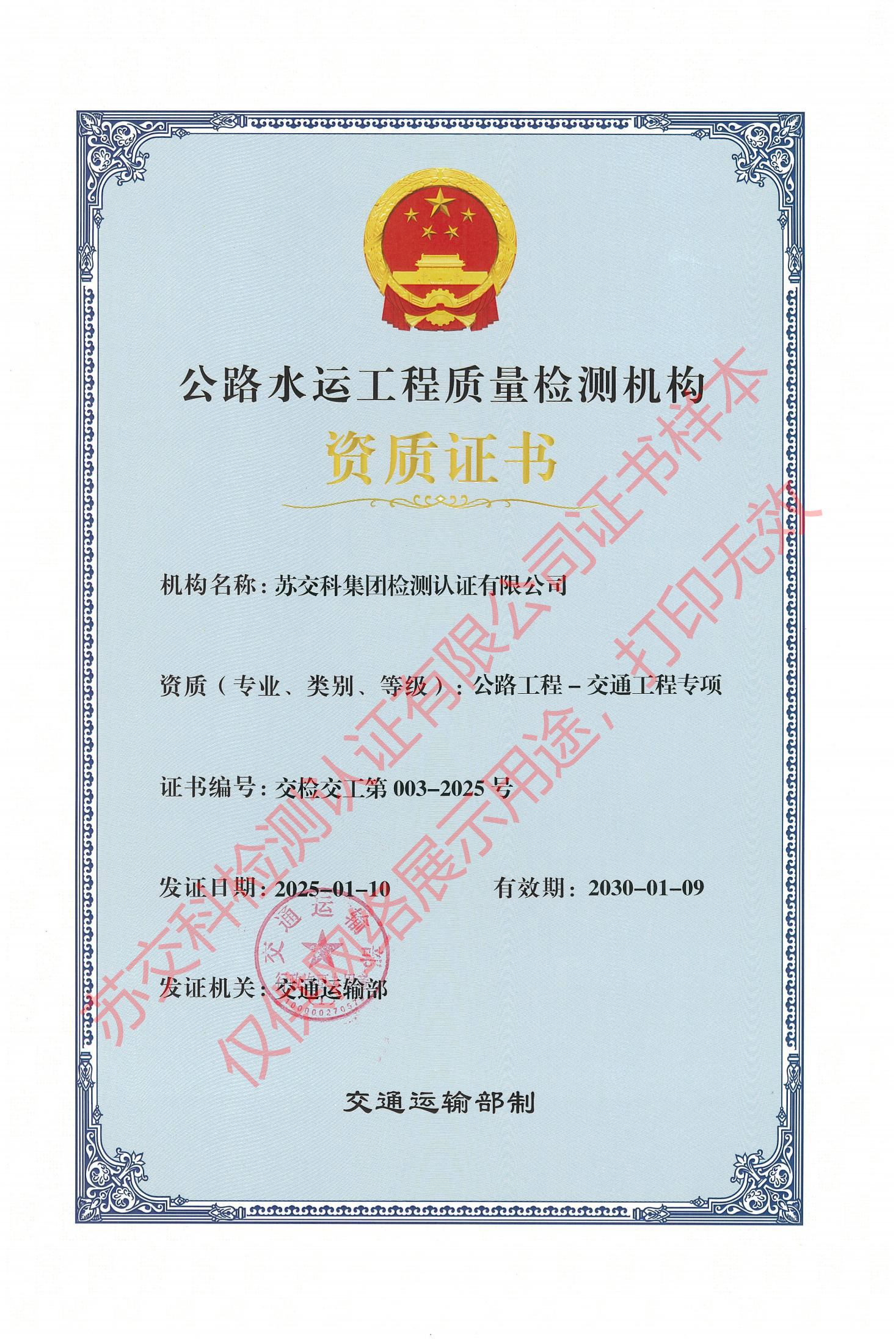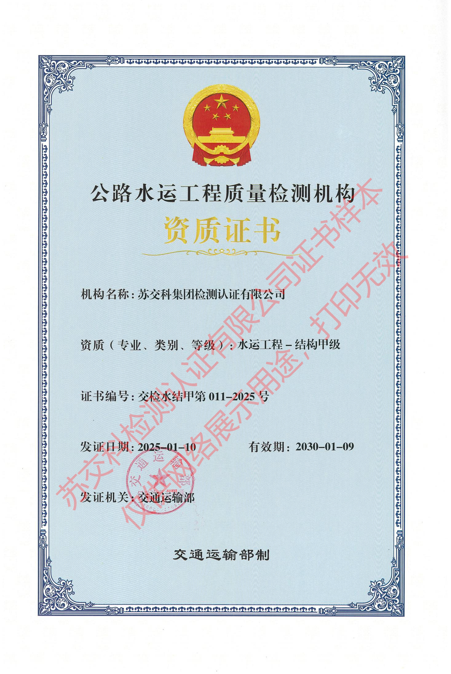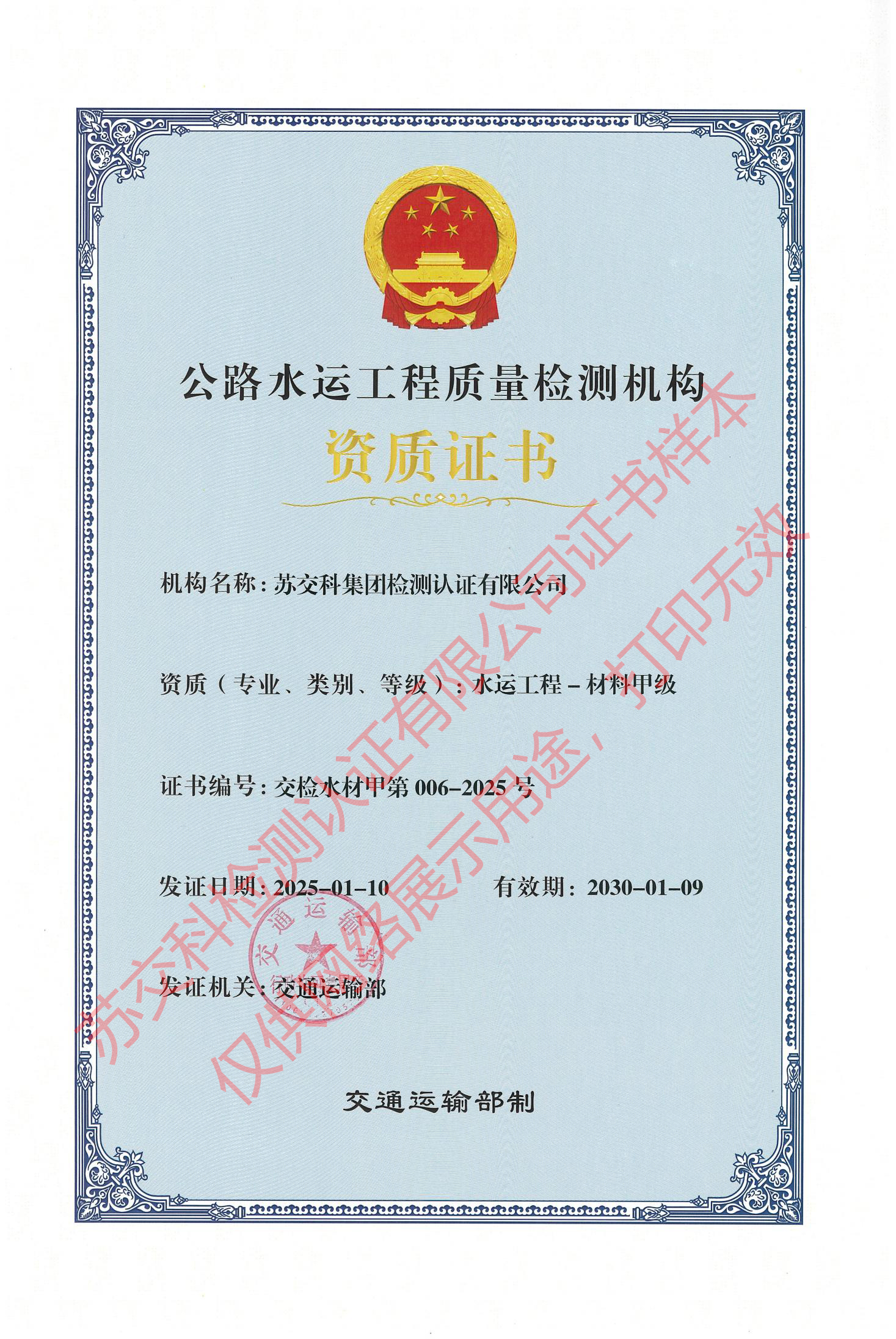 蘇交科檢測認(rèn)證水運(yùn)材料甲級(jí)
