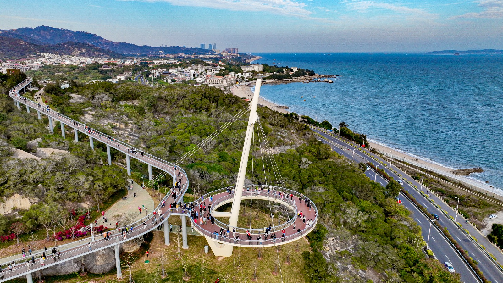 項目秉持 “生態優先、以人為本” 理念,打造 “梅海花臺”、“萬石蒼海”、“盼歸塔” 等地標節點,讓游人盡享 “穿林海、登高峰、賞湖景、瞰海天”之愜意。保護山林生態環境,采用鏤空橋面鋪裝保護原生喬木,再生水回用于消防、灌溉及路面沖洗,對山林環境實現低影響、輕介入。主線全程無障礙通行,設置34處出入口及多處無障礙設施,便捷串聯沿線景區、景點及民宿群落,豐富旅游業態。項目運用BIM技術優化異形結構設計,同步構建橋梁健康監測與智慧管理系統,實現低碳運維與安全管控一體化。