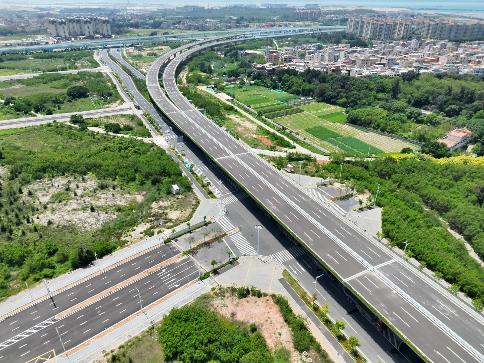 溪東路(翔安南路-機場快速路段)全長6公里,由陸地高架橋、跨海大橋與3座互通立交群組成,構建了多層次交通體系,高架層主路以快速路標準實現高效通行,地面輔路銜接城市主干網;1.3公里雙層跨海大橋驚艷亮相—上層機動車道流暢通達,下層專屬慢行系統串聯兩岸,獨特橋梁造型獲得外觀專利,打通大嶝島慢行交通脈絡。三大互通立交群暗藏巧思:茂林、東園互通以全互通設計實現快速路無縫轉換,蟳窟 Y 型立交精準銜接機場動線,通過交通模型分析與主輔系統分離設計,在復雜城區環境中破解了車流交織難題。創新應用無砂真空預壓工藝,攻克深厚淤泥地基處理難題。